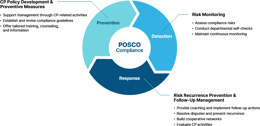Since the launch of the CP in 2002, POSCO has built a fair trade compliance framework based on the three core pillars of prevention, detection, and response to effectively manage legal risks. In accordance with the Fair Trade Commission’s guidelines, we have adopted the eight key CP elements and established a Compliance Council to reinforce the program’s implementation.